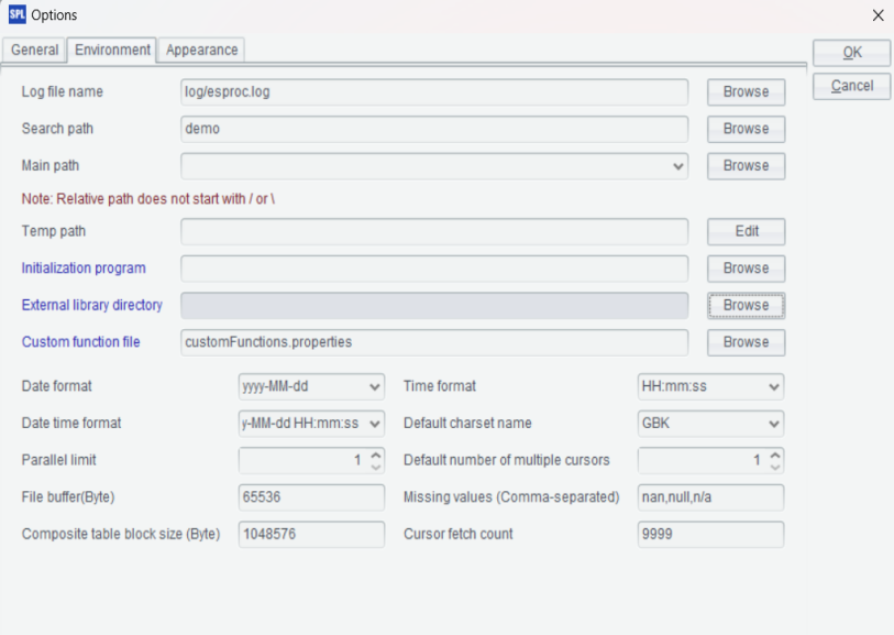 Start esProc, and select Tool > Options > Environment from the menu bar to open up the following interface: