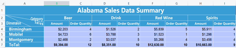 A4: Group and stretch vertically by City; B2: Stretch horizontally by Category. For intersection areas, perform sum operation on Amount and count operation.
