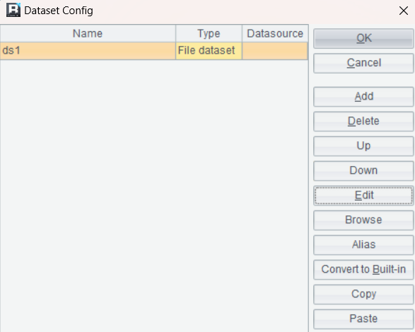 The ds1 in the Name column is automatically generated, representing the name of the xls file read into ReportLite. In the report template, this name is used to set the binding relationship between cell and data. In esProc script, the data in the report can be replaced based on this name.