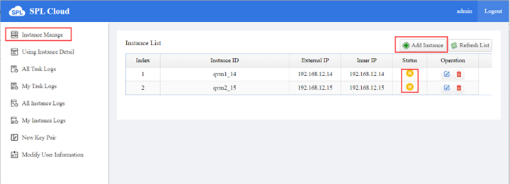 When QVM runs normally and in the idle status, “Status” icon is displayed as above. On the management side of the “Instance Manage” functionality, there are also ordinary functionalities, which we’ll just skip.
