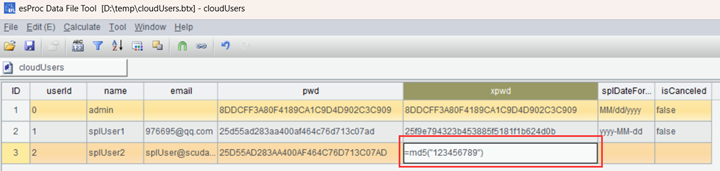 User information is stored in an open format btx file, which is esProc installation directory/esProc/q-server/webapps/qva/WEB-INF/home/cloudUser.btx. The administrator can use btx editor, which is esProc installation directory/esProc/bin/btx.exe, to edit the file. When editing user information, remember that the password must be encrypted (signed) using md5() function.