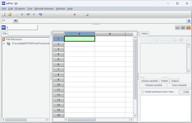 To check whether the installation is successful, we can first start IDE before deployment through the URL esProc installation directory/esProc/bin/ esproc.exe. There is also an eye-catching IDE icon on the desktop. The IDE interface after startup is like this: