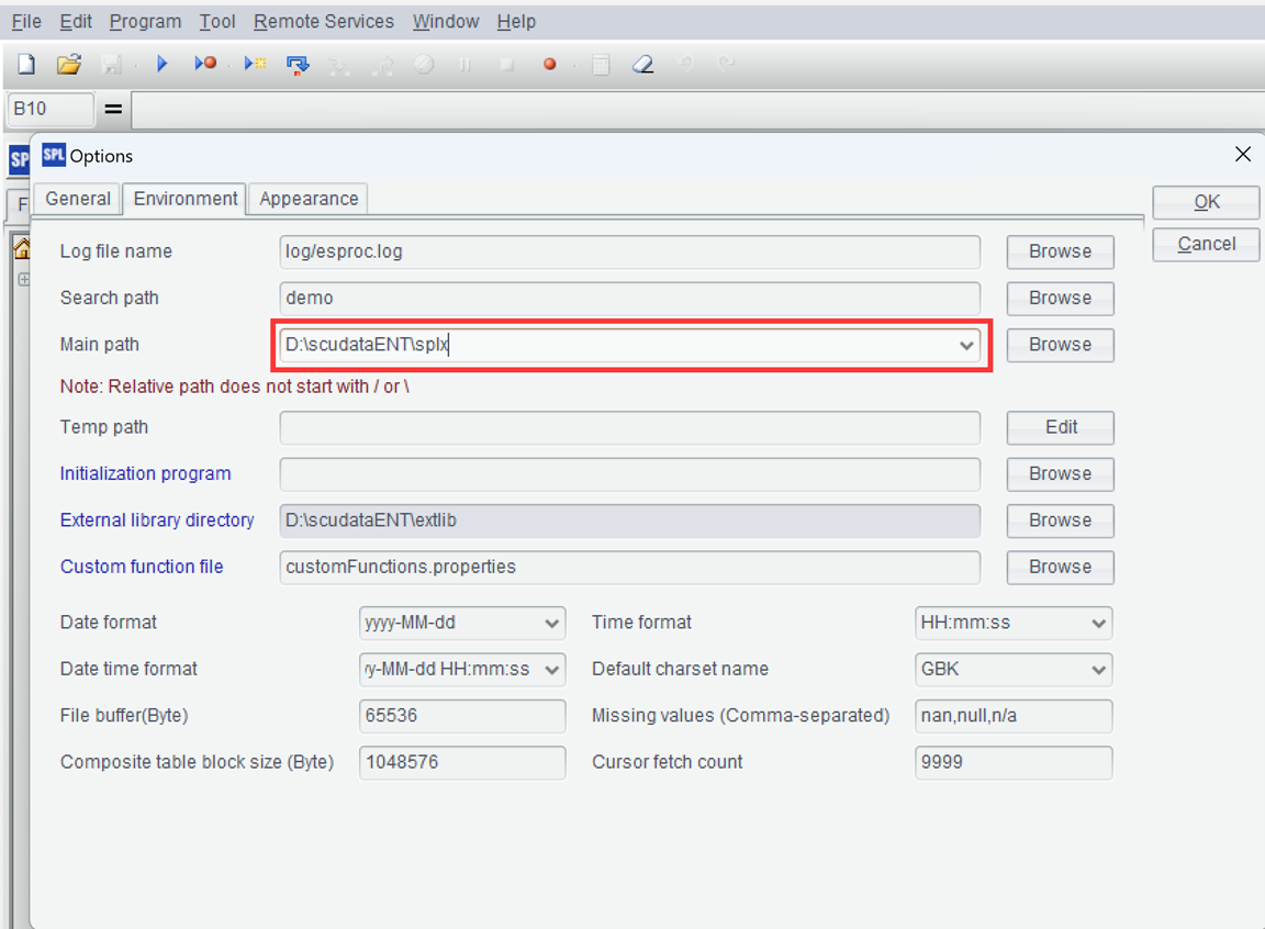 The IDE main directory is the root directory accommodating QVM scripts and data files. The default path (when left blank) is esProc installation directory\esproc, and we should navigate or enter the appropriate path. Edit the other configuration items as needed.