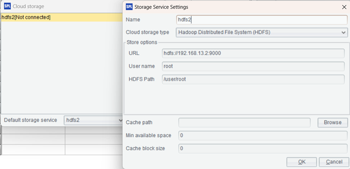 store: Remote storage information. For HDFS, urlName, username and hdfsPath are connection information, and bCacheEnable specifies whether to enable cache or not (default setting is false, which means “do not enable cache”).