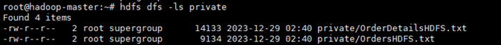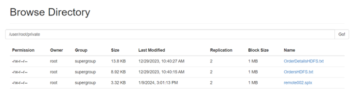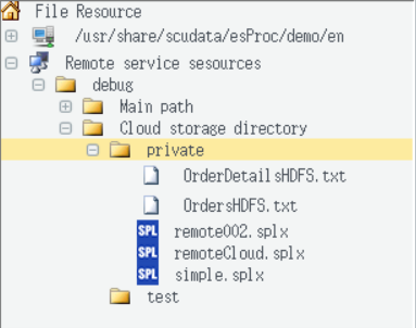 We need to upload data to the remote storage before writing a SPL script. Take HDFS as an example. First, we log in on HDFS client side or a cluster node, create a directory (such as private) using hdfs dfs -mkdir command, upload data files using hdfs dfs -put command, and view the upload result through hdfs df -ls command. The result is as follows: