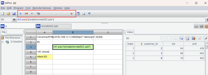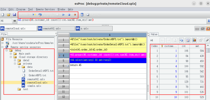 Write a QVM script in the activated remote storage context and perform full-featured debugging in IDE. For example, we have a script remote002.splx, which groups and summarizes two txt files stored in remote storage and filters data according to the external parameters.