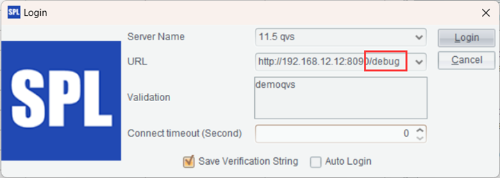 Start IDE, enter “Remote Services-Login” in the menu bar and enter the connection information of the debugging mode QVS in the window to log in on it.