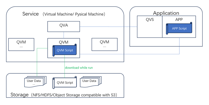 The APP script accesses QVS through Qconnect() function and requests QVM from QVA. Download the APP script from remote storage and execute it.