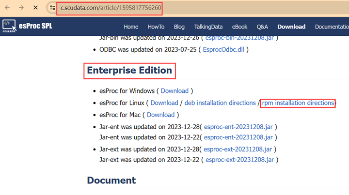 2. Install esProc Enterprise. Different Linux versions require different formats of installation packages. Here we take rpm packages as an example, and you can perform operations according to directions in the hyperlink. The key step is using wget command to download the package and rpm command to install the application. The QVA root directory after setup is called esProc installation directory hereinafter.