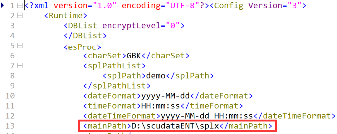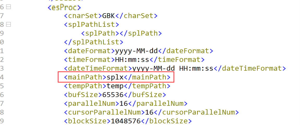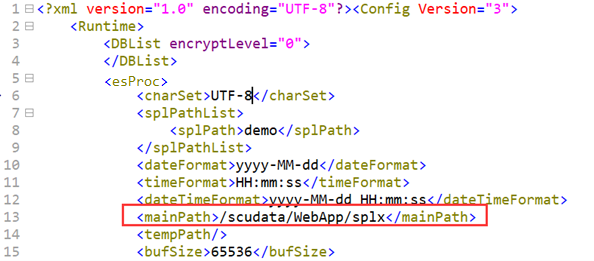 2. Modify SPL settings on QVS. The configuration file is located in esProc installation directory\esProc\q-server\webapps\qvs\WEB-INF\home\raqsoftConfig.xml. The key item is the main directory mainPath, which is QVS’s root directory. The mainPath can be an absolute path or a relative path. When it is a relative path, it is relative to esProc installation directory\esProc\q-server\webapps\qvs\WEB-INF\home.