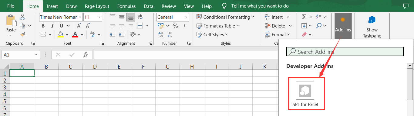 2. Open Excel (The version number of Excel2021 used in the following example is 2408), and load the custom SPL for Excel add-in through 【Options】->【Add-ins】.