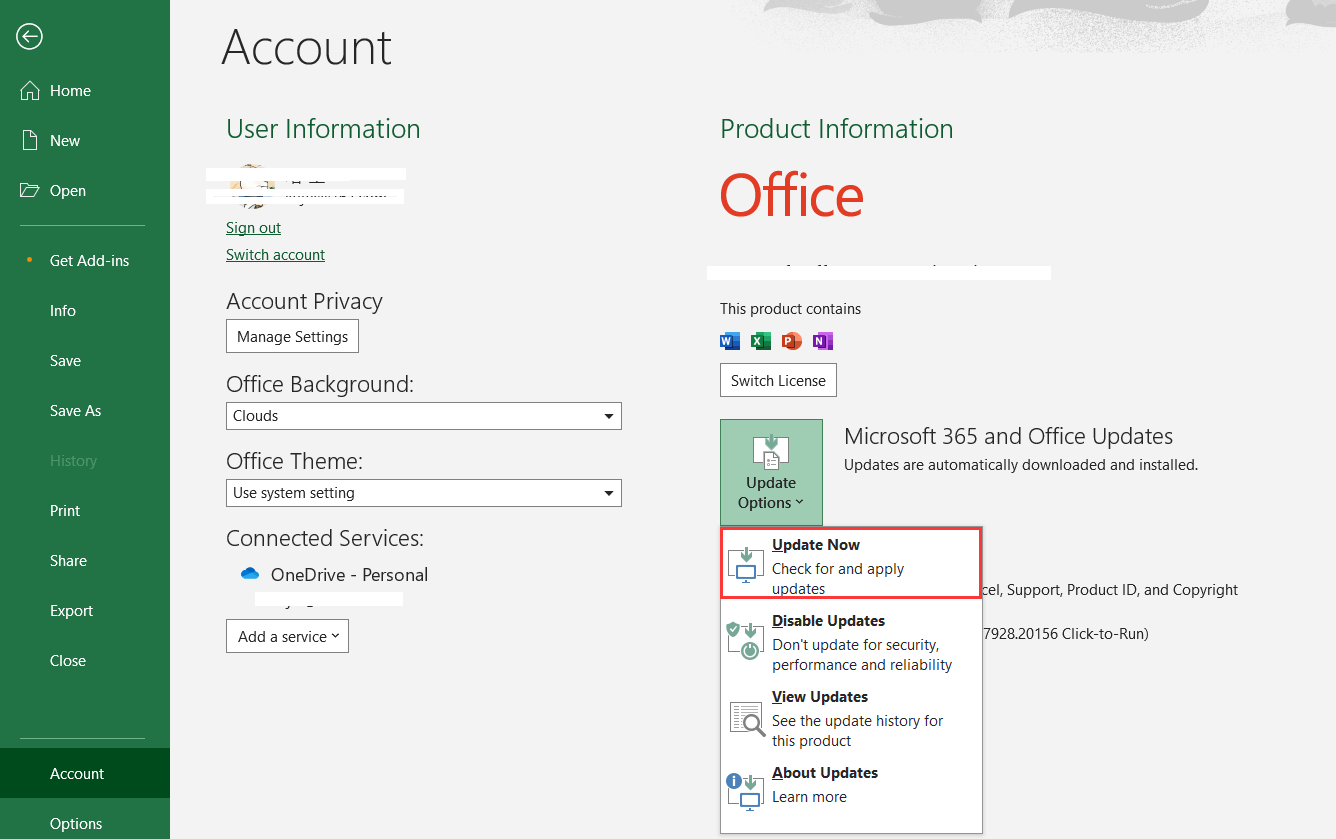 If you cannot find 【Add-ins】, click on【Account】->【Update Options】->【Update Now】 to update orupgrade Excel.