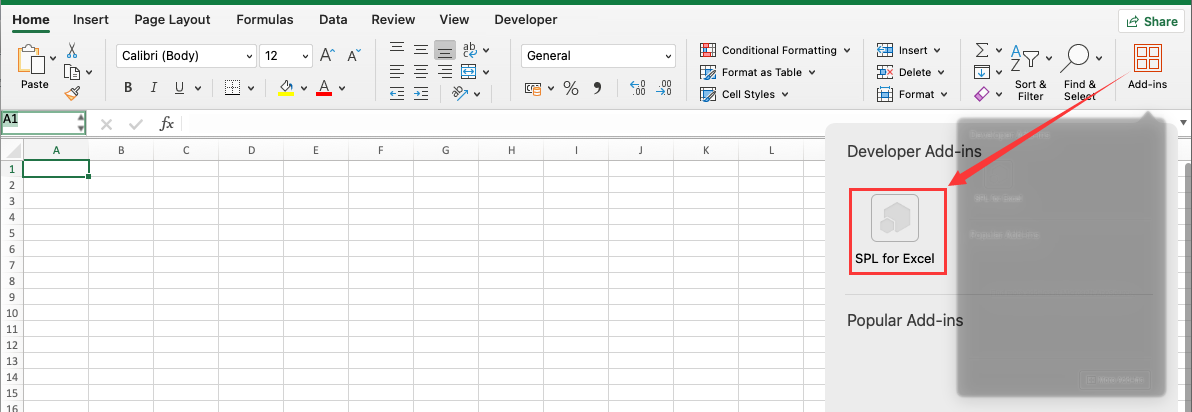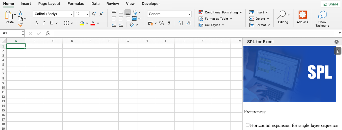 2. SPL for Excel. Open Excel (The version number of Excel for Mac used in the following example is 16.89), and load the custom SPL for Excel add-in through 【Options】->【Add-ins】.