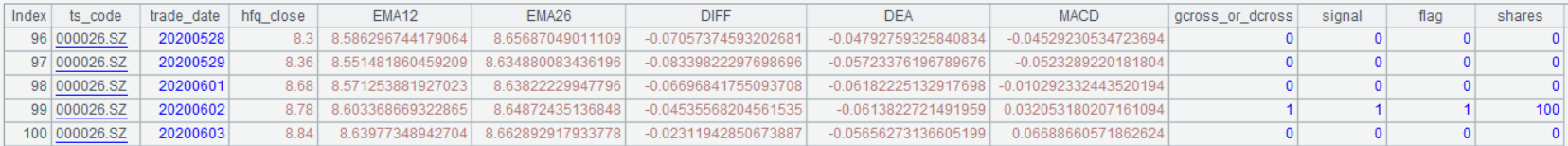 | 13 | =ps=0,A6.derive(if(ps==0&&signal==1,(ps=1,1),if(ps!=0&&signal==-1,(ps=0,-1),0)):flag,if(flag!=0,100,0):shares) |