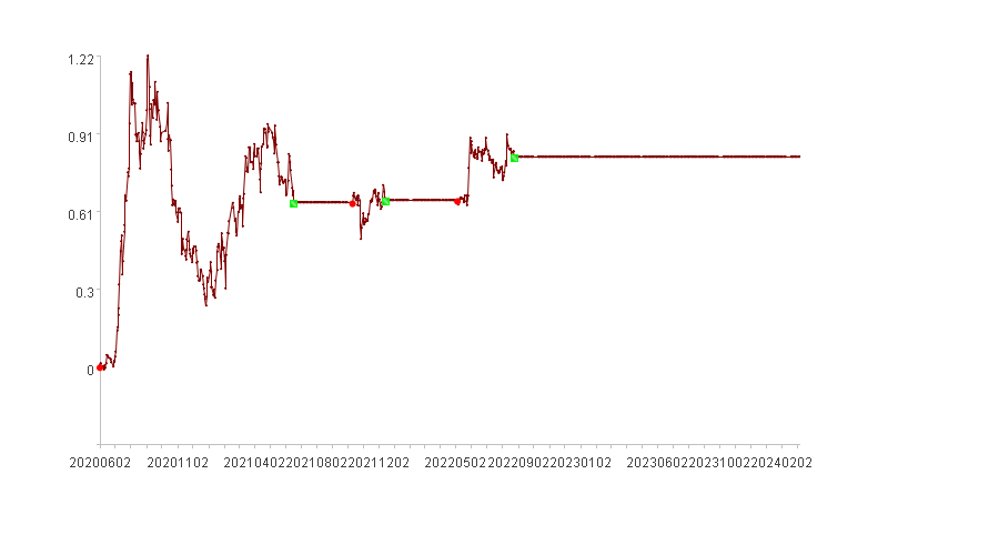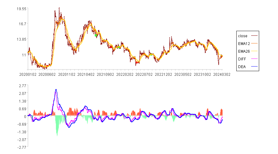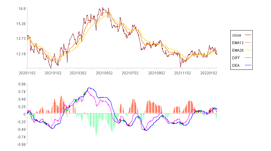 In the above chart, the upper part displays stock prices and short-term and long-term EMAs; the lower part shows MACD’s DIFF, DEA and red and green bars of MACD. The red dots represent golden crosses and green squares are death crosses.