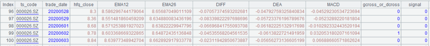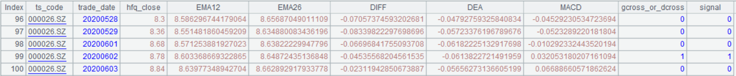 A6: Compute golden cross and death cross – the golden cross occurs when gcross_or_dcross=1, the death cross occurs when gcross_or_dcross=-1, and in all other time gcross_or_dcross=0, and add a buy/sell signal field (signal) whose initial value is set as 0.