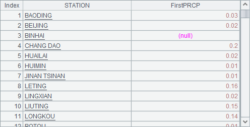 A7 loops through record of each station to perform the target computations. Expressions splited by the commas x1,x2,…xn are computed or executed in order and result of the last expression will be returned. For each station compute the yearly average wind speed and store the value in variable avgWDSP for use in the subsequent computations. Then A.run()function assigns values to new fields in order, during which brackets [] implement a cross-row computation, such as TEMP[-1], which is the temperature in the previous day, and PRCP[1] representing the precipitation in the next day, and the temperature difference in the first day is set as 0. After value assignment is finished, A7 gets the following result:
