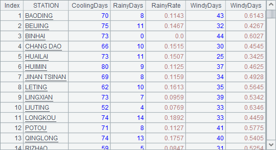 | 9 | =A8.new(STATION, ~.count():CoolingDays, ~.count(RainTomorrow):RainyDays, round(RainyDays/CoolingDays,4):RainyRate, ~.count(WindyTomorrow):WindyDays, round(WindyDays/CoolingDays,4):WindyDays) |