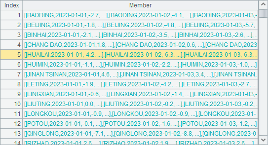 A8 selects records where the temperature decreases by over 2 degrees for use in the later computation. Its result is a sequence consisting of record sequences, where a record sequence is a sequence made up of table sequence records. In A9, A.new()function generates the result table sequence, during which round() function is used to keep 4 decimal places for the ratio value.