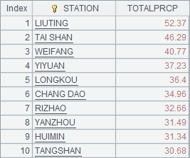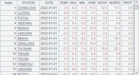A4 and A5 respectively find stations where precipitation rank top 10 in the two years. Parameter -10 is used to get the top10 stations with the most precipitation. The syntax has the same effect as -TOTALPRCP. Below is A4’s result set:
