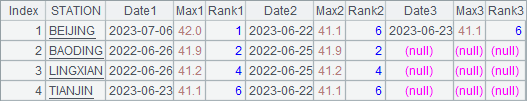 | 10 | =A9.groupc(STATION;DATE,MAX,Rank;${8.([“Date”/~,“Max”/~,“Rank”/~].concat@c()).concat@c()}) |