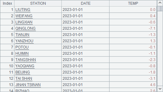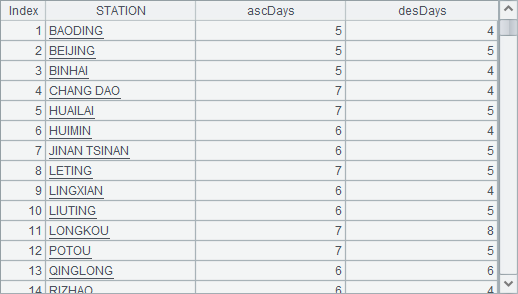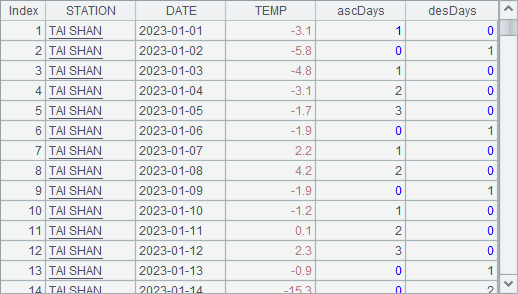 A4 loops records of each group to assign values to ascDays field and desDays field. If temperature increases on the current day, add 1 to ascDays value and reset desDays value to 0; if temperature decreases, reset ascDays value to 0 and add 1 to desDays value; and if temperature does not change, reset both values to 0. Execute A4 and then we can view detail data in any of A3’s groups. Here are detailed records at TAISHAN station: