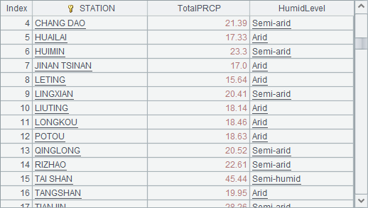 A7 adds a humidity level field, during which segp()function gets the correponding level from the precipitation interval table by matching TotalPRCP value with PRCP ranges and works with @r option to enable left-open and right-closed intervals. The precipitation interval table is not necessary for handling the interval-based computation. Instead, we can direclty use a sequence. If we modify A7’s code as =B6.derive([B1:B4]([A1:A4].pseg@r(TotalPRCP)):HumidLevel), we can get the same result. The only difference is that pseg() will find the interval number corresponding to the precipitation and then get the humidity level by the result.