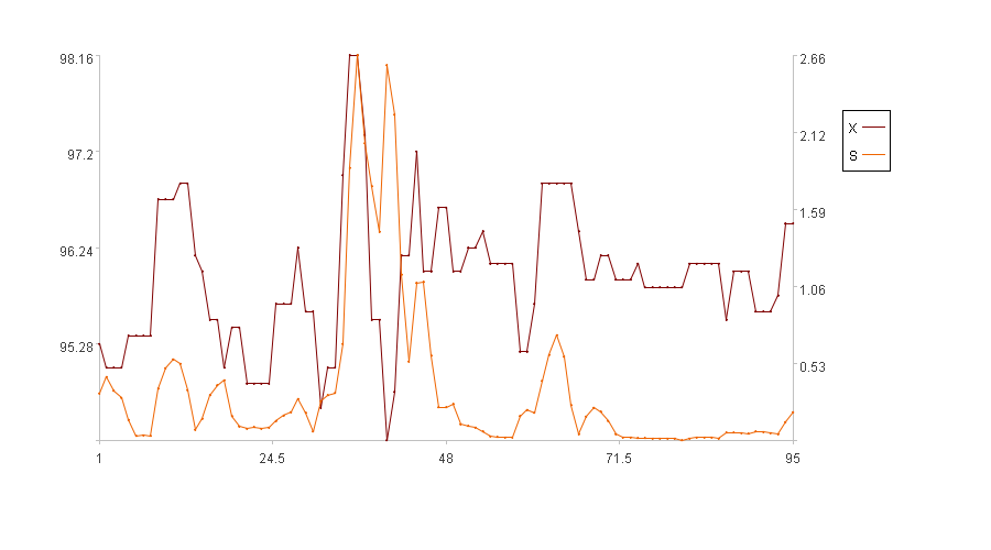 In the figure, the x-axis represents the sequence index, the left y-axis represents the values of the original series X, and the right y-axis represents the values of the dispersion S. In the legend, X is the original series and S is the dispersion. (Because the first five time points have no dispersion, the figure only displays the dispersion for the subsequent 95 time points).