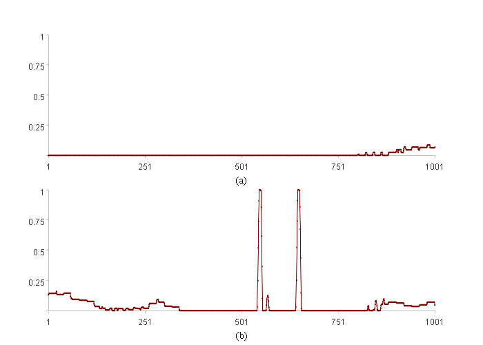 Figures (a) and (b) show the alarm intensity trends for the first and second dimensions, respectively. As seen in the figures, within the learning interval ([1, 1000]), the second dimension exhibits more frequent alarms and higher alarm intensity than the first dimension, indicating that its weight should be lower. The weights calculated in the routine matched these expectations, with values of 0.88 and 0.12, respectively.