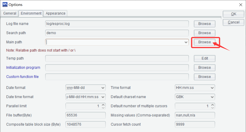 Click Tool/Options to set the main path: