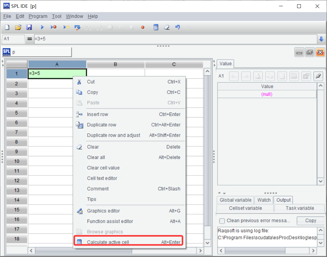 Excel automatically computes the current cell once an expression is entered and carriage return or mouse is clicked; in SPL, you must select the current cell, and right click to select Calculate active cell or press Alt+Enter to enable the computation.