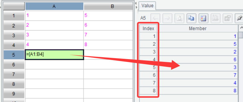 Excel does not support directly displaying a data set like A1:B4 in cells; it has to summarize all values into a single one to display. SPL can directly display a data set in the format of =[A1:B4] and in order. In the above screenshot, column Index highlighted in red box contains sequence numbers of data. In SPL, such an ordered data set is called sequence.