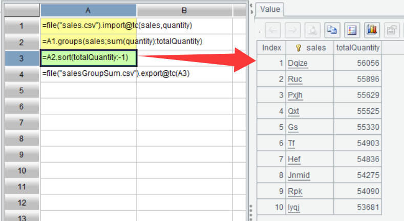 | 2 | =A1.groups(sales;sum(quantity):totalQuantity) |