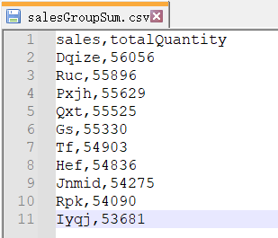 Read sales data from sales.csv, group data by sales, find the order quantity in each group, sort data by quantity, and write the final result to salesGroupSum.csv.
