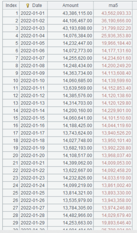 | 3 | =A2.derive(Amount[-2:2].avg():ma5) |