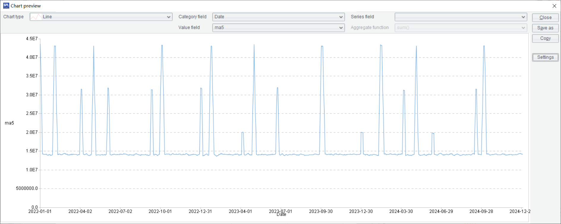 Select Line chart, Date for Category and ma5 for Value, and click Settings button to get the following pop-up windows: