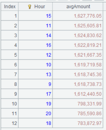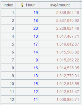 | 5 | =A3.groups(Hour;avg(Amount):avgAmount).sort(-avgAmount) |