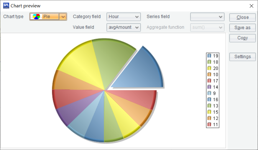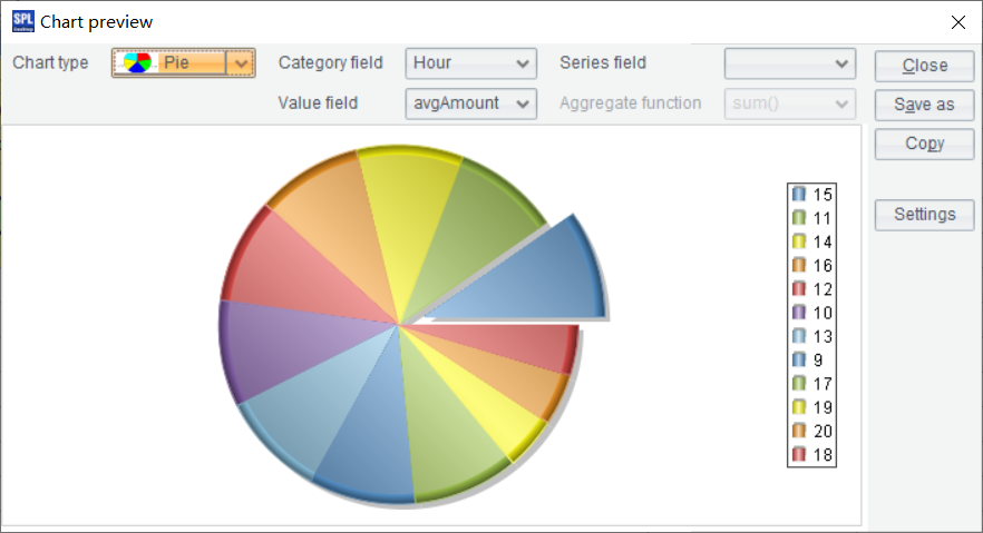 | 2 | =A1.groups(date(orderTime):Date,hour(orderTime):Hour;sum(amount):Amount) |