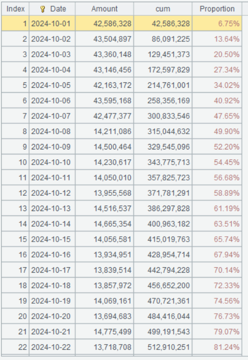 Step 2: Select records of October in the year 2024, group and summarize them by date to get the daily sales, compute the cumulative amount, and divide the target sales by the cumulative sales to get the sales completion rate of the current date.