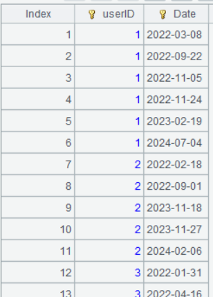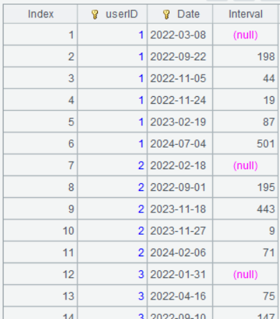 | 3 | =A2.derive(if(userID[-1]==userID,interval(Date[-1],Date),null):Interval) |
