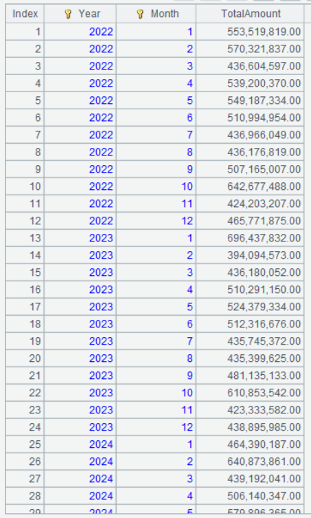 | 2 | =A1.groups(year(orderTime):Year,month(orderTime):Month;sum(amount):TotalAmount) |