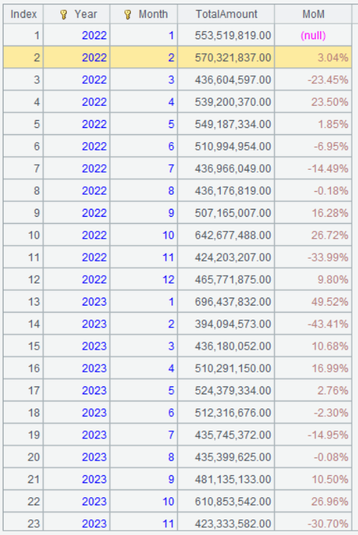 | 3 | =A2.derive((TotalAmount-TotalAmount[-1])/TotalAmount[-1]:MoM) |