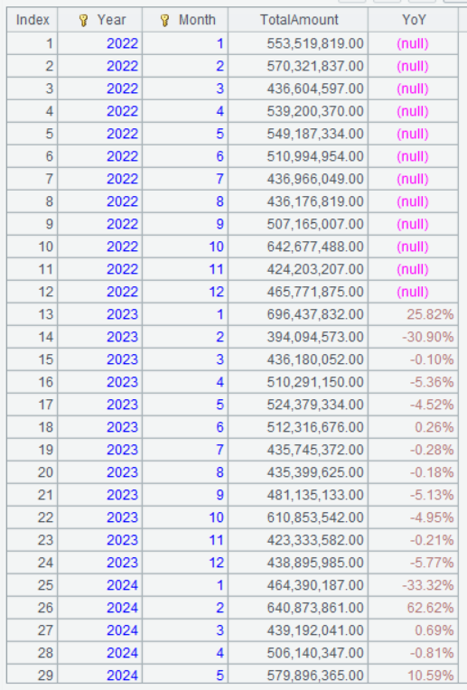| 3 | =A2.derive(if(Year[-1]==Year-1 && Month[-1]==Month, (TotalAmount-TotalAmount[-1])/TotalAmount[-1], null):YoY) |