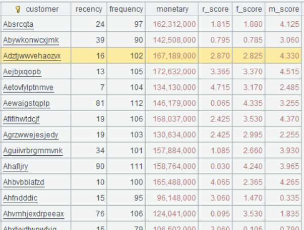 According to the RFM analysis result in the preceding example, categorize customers into five groups using two methods. One method is to perform the grouping according to the three types of scores: r_score, f_score, m_score; the other is to do this according to the weighted scores.