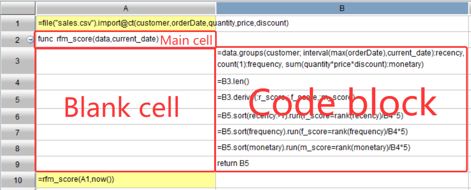 esProc SPL’s code blocks feature a cell range and indents. Not only are they, like Excel, intuitive, but they provide all-round programming abilities, making them particularly suitable for dealing with complicated data computing tasks.