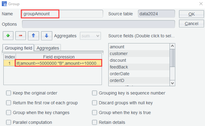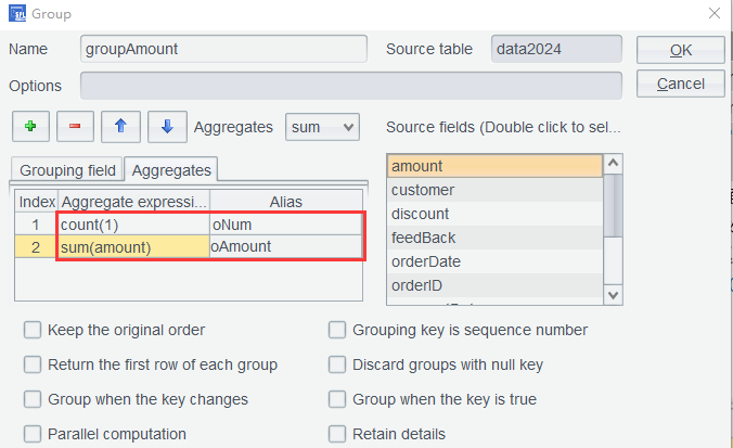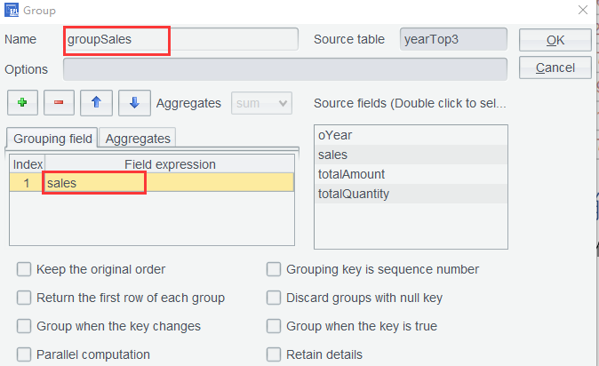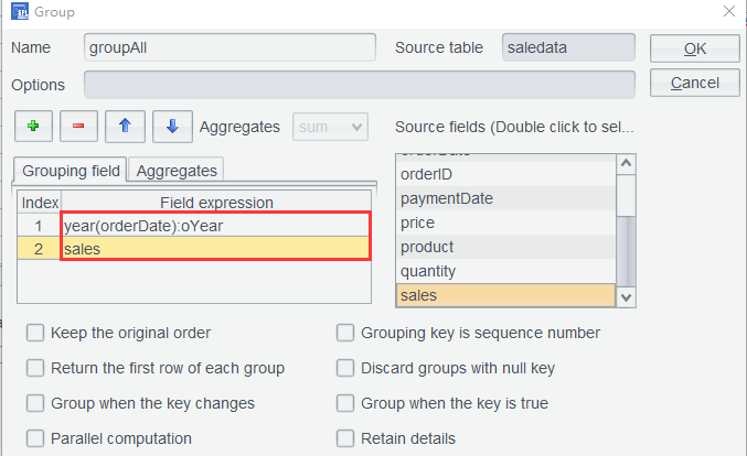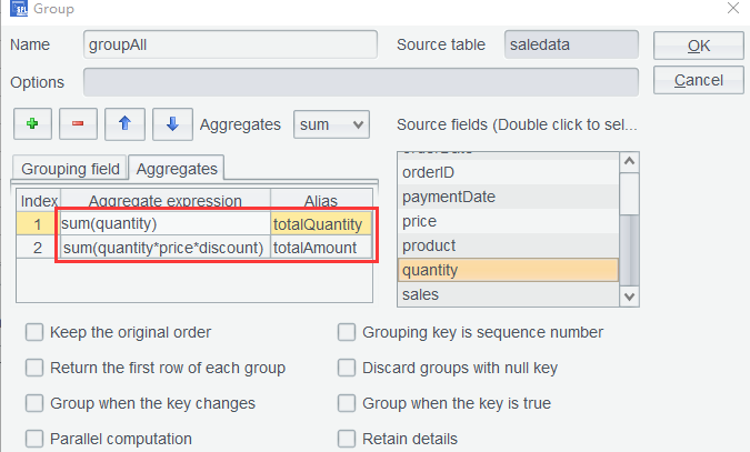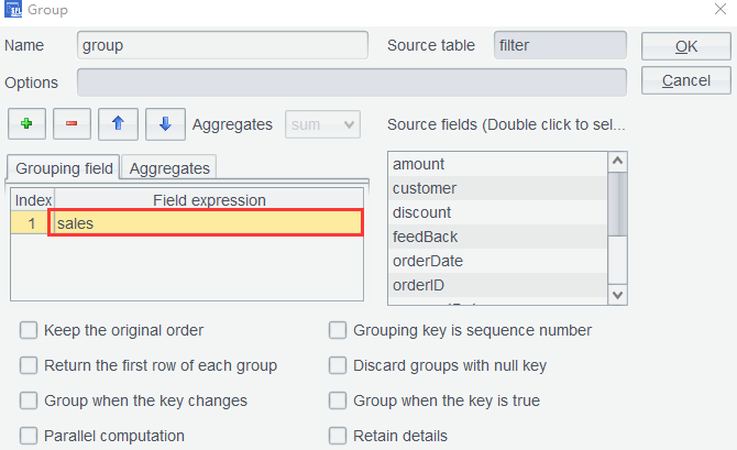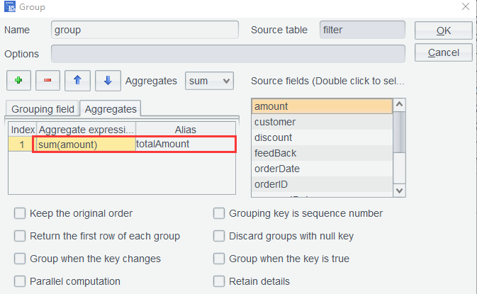 In the second row, formula quantity*price*discount is used in the aggregate expression to compute sum. If you do not care about the intermediate steps, there is no need to add a computed column before performing the grouping. Click OK to get the grouping result: