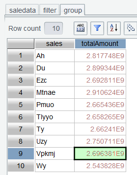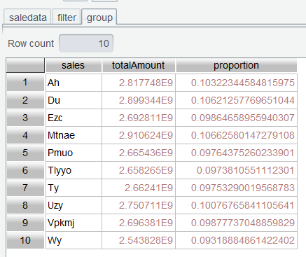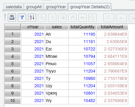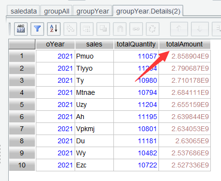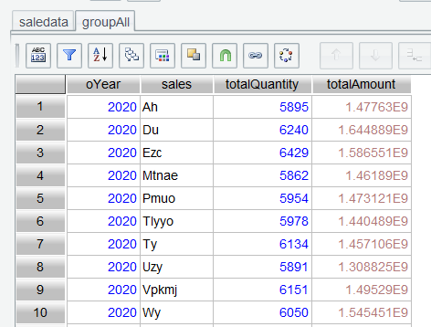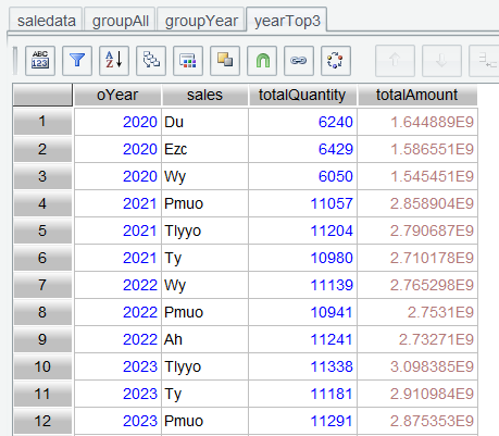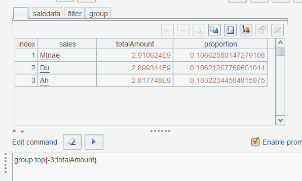 In Section 2.3, we explained how to find top N rankings through sorting on the interface. Here we use top() function to get the top 3. Enter expression group.top(-3;totalAmount) in the Edit Command Zone, execute it, and get the top 3: