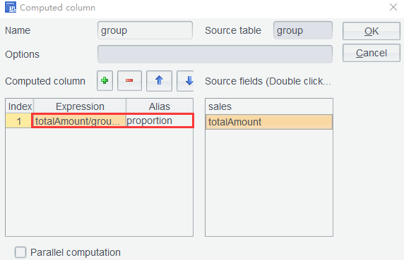 To obtain contribution proportion of each salesperson, you need to compute the ratio of each to the total sales based on group table. Click Computed Column on group table and set expression as totalAmount/group.sum(totalAmount) and alias as proportion: