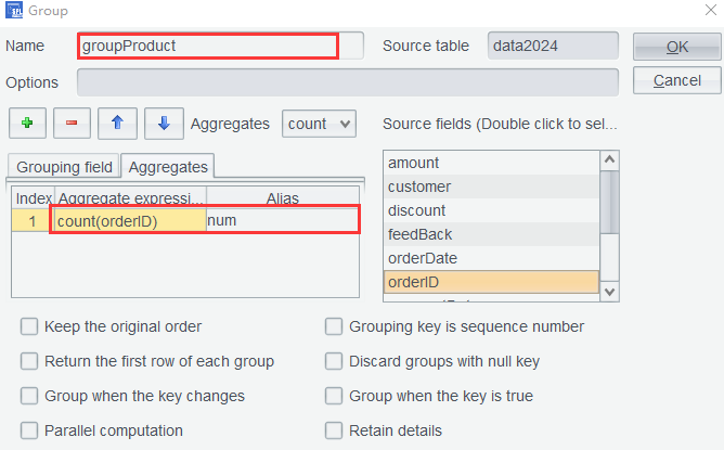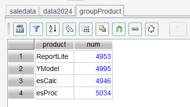 Then select data2024 , place cursor on column product , click Group, set aggregate expression to perform the count, and set table name as the business meaningful groupProduct :