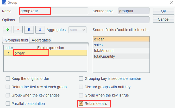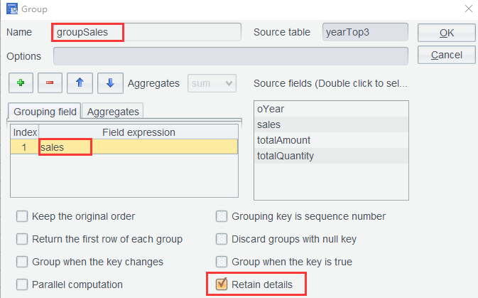 By checking the Retain details option, there is no need to configure the aggregation. You just Click OK and get the result set grouped by salesperson: